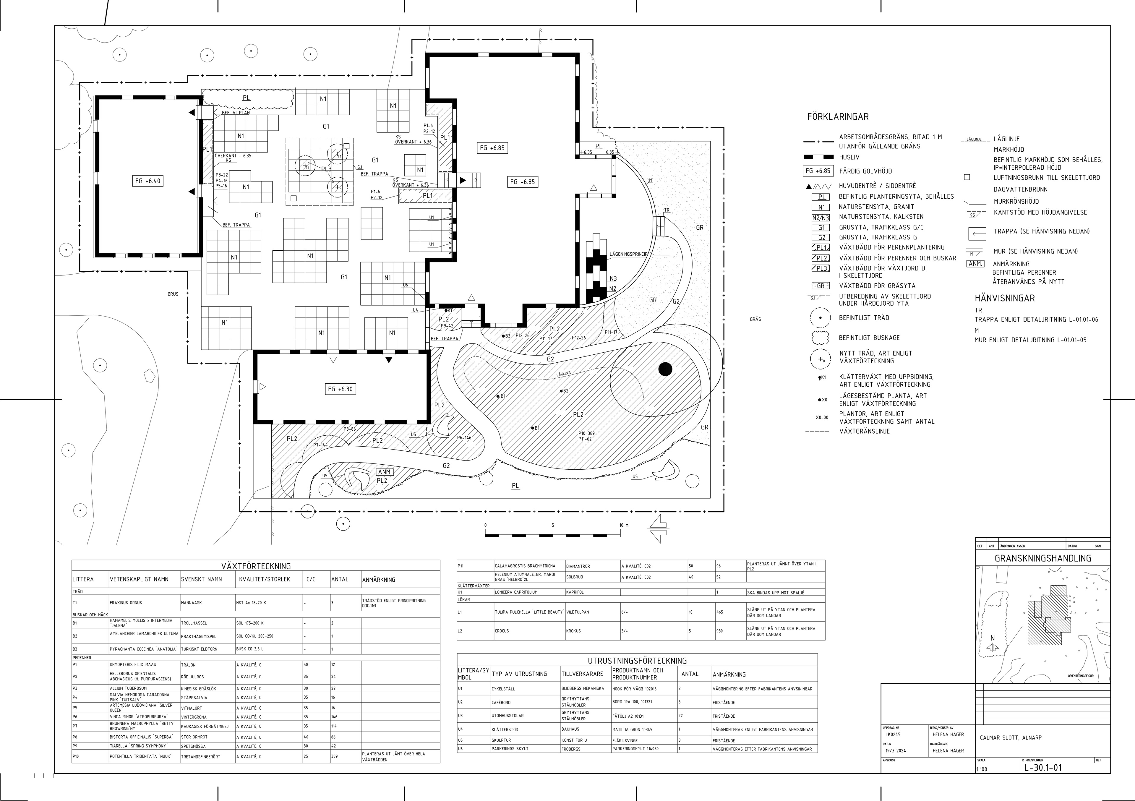 Konceptet bearbetades, material valdes och mynnade ut i ett designförslag för platsen som jag ritade upp i AutoCad. På planskissen ser man två trädgårdsrum med väldigt olika karaktär där det ena rummet följer geometriska former och markplattor i natursten flyter in och ut i gruset och är lagda i ett mönster unikt för den här platsen. Platsen är lätt att möblera om och använda efter behov och ska fungera som en mötesplats. Det andra trädgårdsrummet följer en organiskt formad gång av barkmull där man möts av en kulle med en naturalistisk plantering med gräs, lökar och blommande buskar. Man kan slå sig ner på skulpturerna som står utplacerade i parken och njuta av vegetationen. En detaljritning för en stödmur designades och ritades också upp i AutoCad.